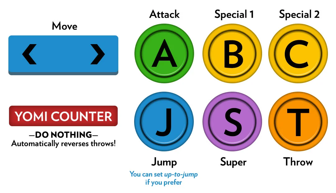 To jump, press the jump button. You can map it to “up” if you prefer, but the default controls use a jump button because it feels pretty good to only have to worry about pressing left and right with your left hand. Also, it’s often good to jump then do an attack right away in Fantasy Strike. This is a bit easier to do when the jump button and the other button both use your right hand, rather than coordinating it with the up from your left hand (but again, you are free to remap the controls however you like).